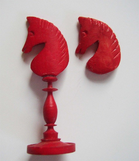 halve centimeter hoog paardenhoofdje van been. Gesneden om een schaakspel te completeren waarvan een van de mooi gedraaide voetjes zijn hoofdje had verloren. Inmiddels heeft deze oma bij dit soort kleine werkjes een leesbrilletje en een loep nodig. Nou ja, het lukt in elk geval nog steeds. Ik heb het been gekleurd met olieverf, karmijn. Of het origineel ook met olieverf is gekleurd weet ik niet. Ik denk dat mijn kopie na het drogen (op de foto is het nog nat) wel wat matter wordt.